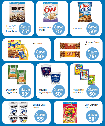 SAVE on Hamburger Helper, Food Should Taste Good chips, LÄRABAR Über Bars, Bisquick, Yoplait, Betty Crocker Fruit by the Foot, Fruit Gushers OR Fruit Roll-Ups, Lucky Charms, Hershey' Cookies 'n' Creme cereal, Vanilla Chex, Mountain High Yoghurt, Chex Mix, Green Giant Veggie Snack Chips, Fiber One Chewy Bars/90 Calorie Products, Nature Valley Protein Crunchy Granola, Green Giant Seasoned Steamers or Valley Fresh Steamers Frozen Vegetables, Reese's Puffs, and Liberté Greek or Liberté Méditerranée yogurt.