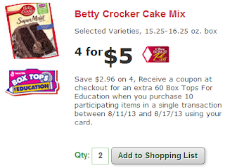 PLUS RECEIVE $.75 SavingStar Deposit WYB 2 Betty Crocker Ready To Spread Frosting, Supreme Brownie Mix, Dessert Bar Mix, Supermoist Cake Mix or Cookie Mix 17.5oz Exp 8/31/13