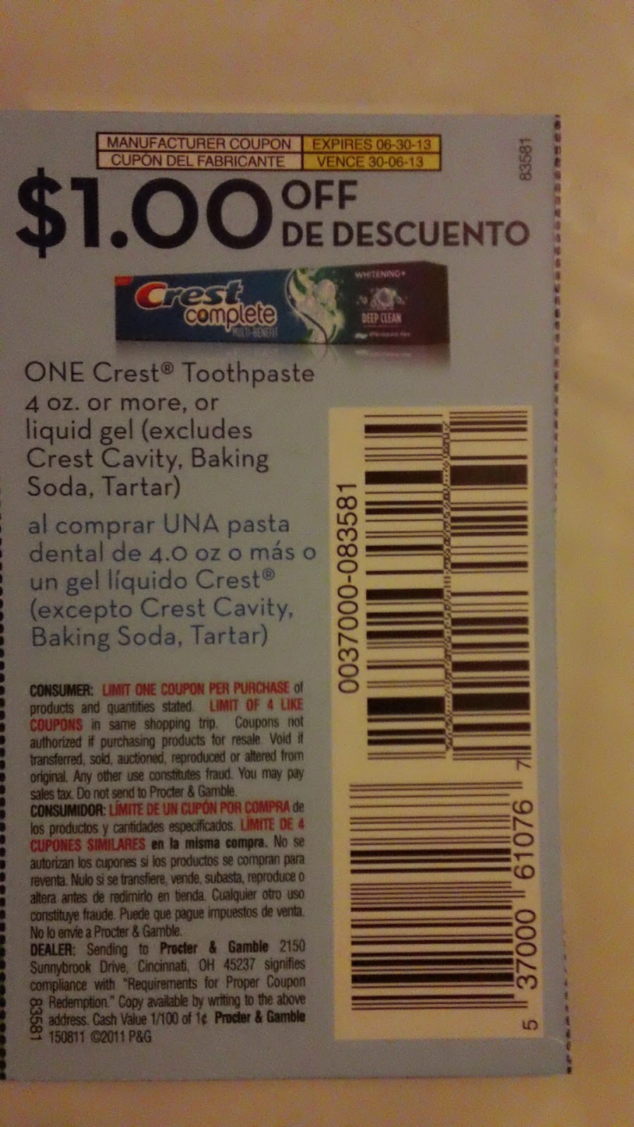 USE $1/1 Crest Toothpaste 4oz+ or Liquid Gel (Excludes Crest Cavity, Baking Soda, Tartar) Coupon from inseide Crest Toothpaste Packages Exp 6/30/13 ~ See Picture Below