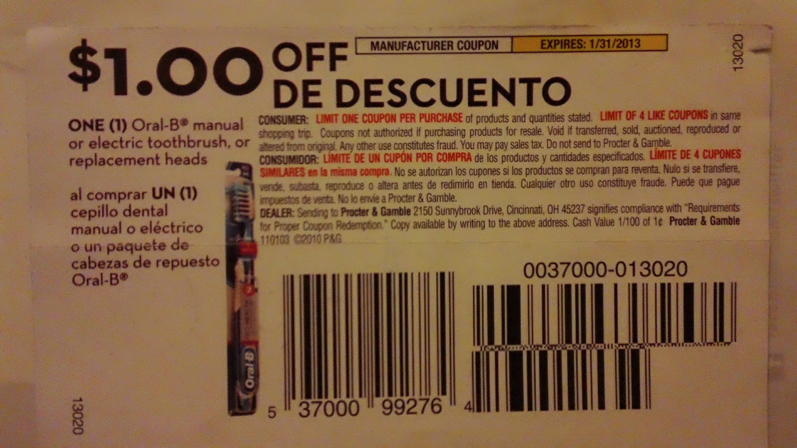 USE $1/1 OralB Manual or Electric Toothbrush or Replacements Heads Coupon from inside Crest Toothpaste Packages Exp 1/31/13